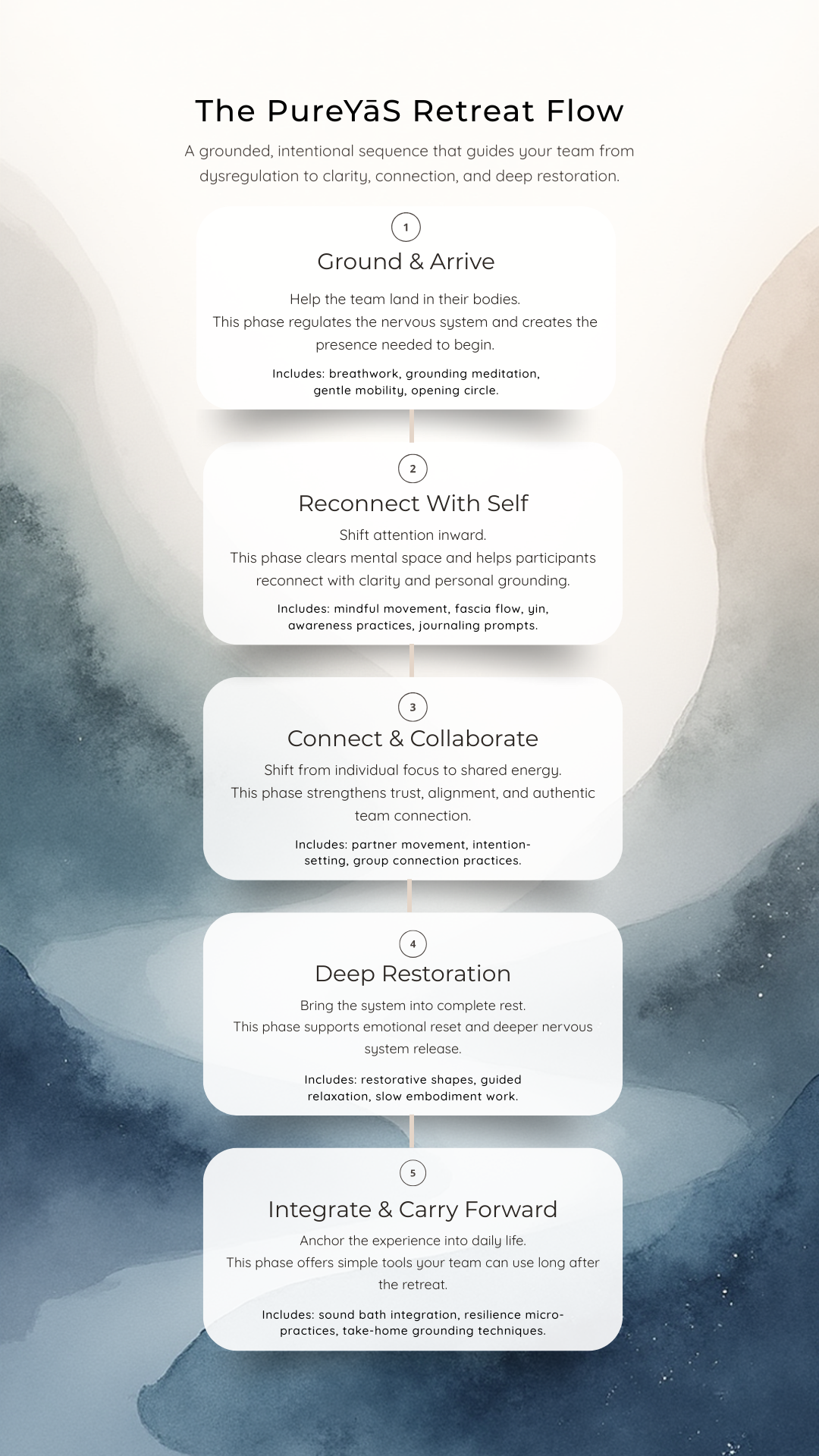 Every organization carries its own rhythm — its stress patterns, communication habits, energetic signatures. A PureYāS retreat meets your people where they are, supporting the humans behind the work so your whole culture can shift with intention.