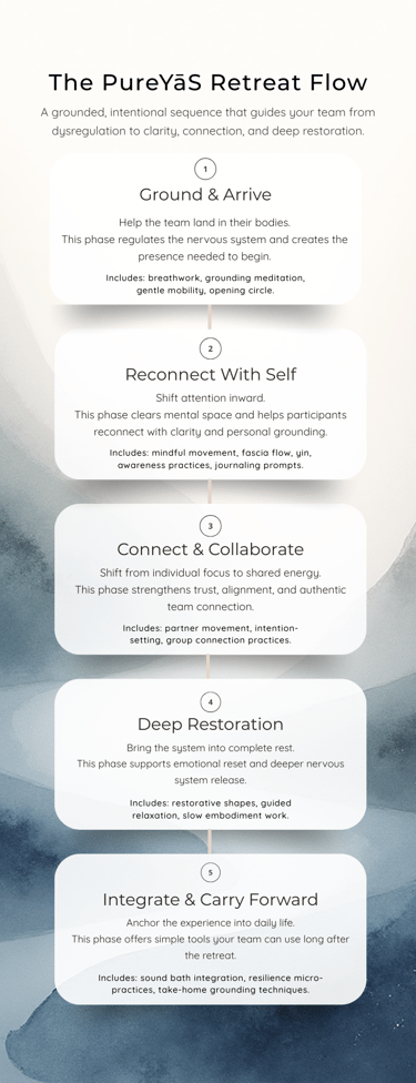 PureYāS corporate retreats are intentionally designed to give teams what they rarely receive: a structured, restorative pause that strengthens their capacity.